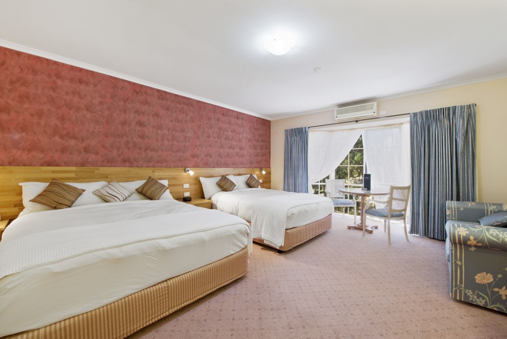 Non smoking motel room with a King bed and Queen bed and a private bathroom with a shower. Has all standard motel facilities such as flat screen television, DVD player, tea and coffee making facilities, iron and ironing board, minibar, electronic key card door locks, reverse cycle air-conditioning and an in-room safe. Located in the back section of the property. MAXIMUM OCCUPANCY 4 PEOPLE - please ensure that the correct occupancy is entered as additional charges may apply.