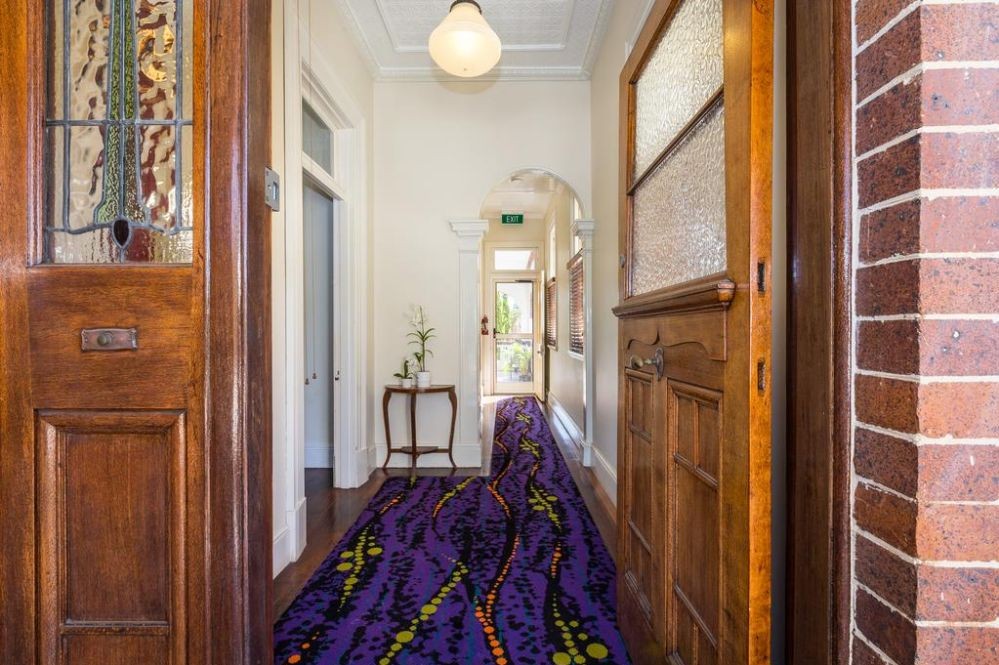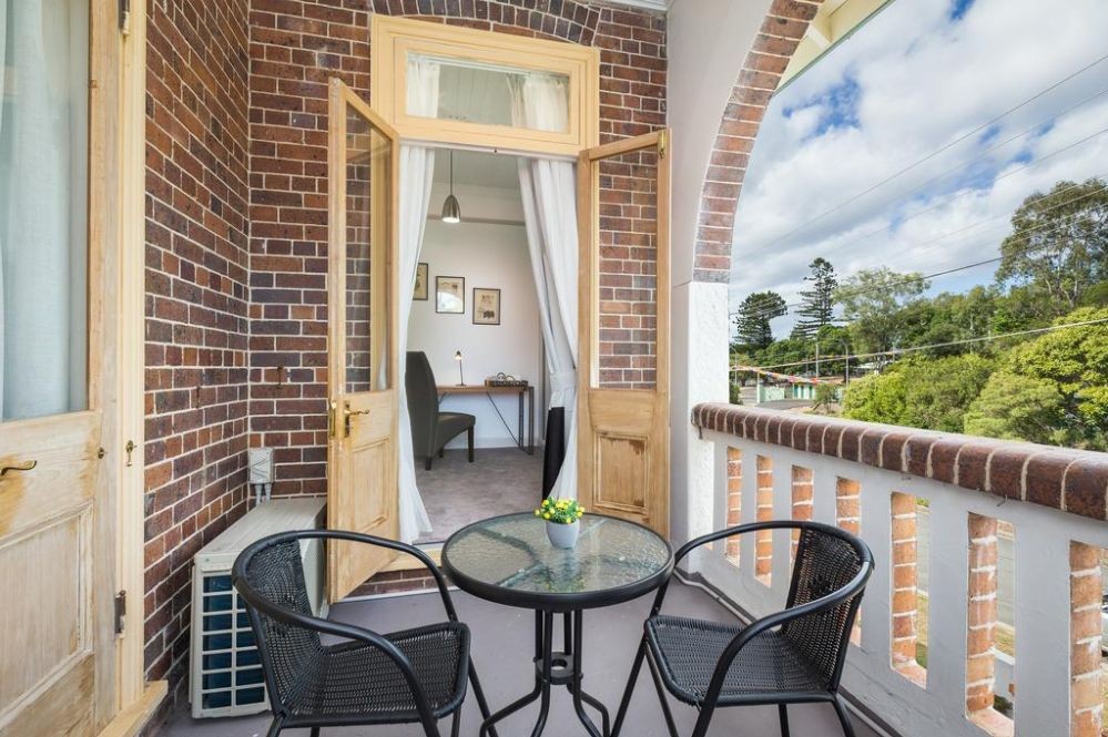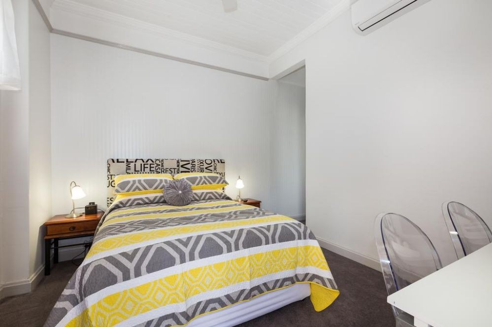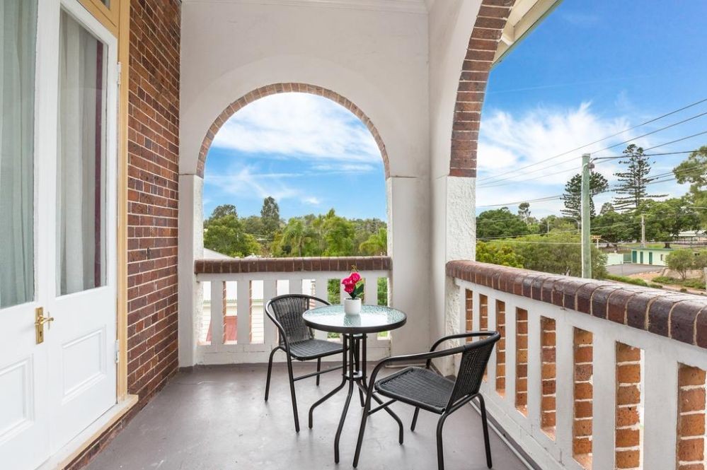 This spacious air conditioned room with an original cedar Fireplace has 12ft ceilings with a door opening onto a large balcony overlooking the Ipswich city.