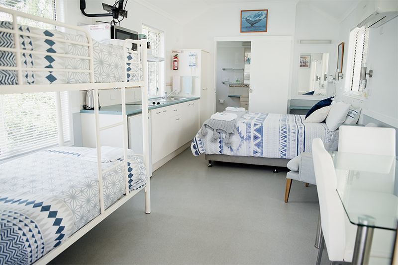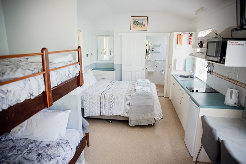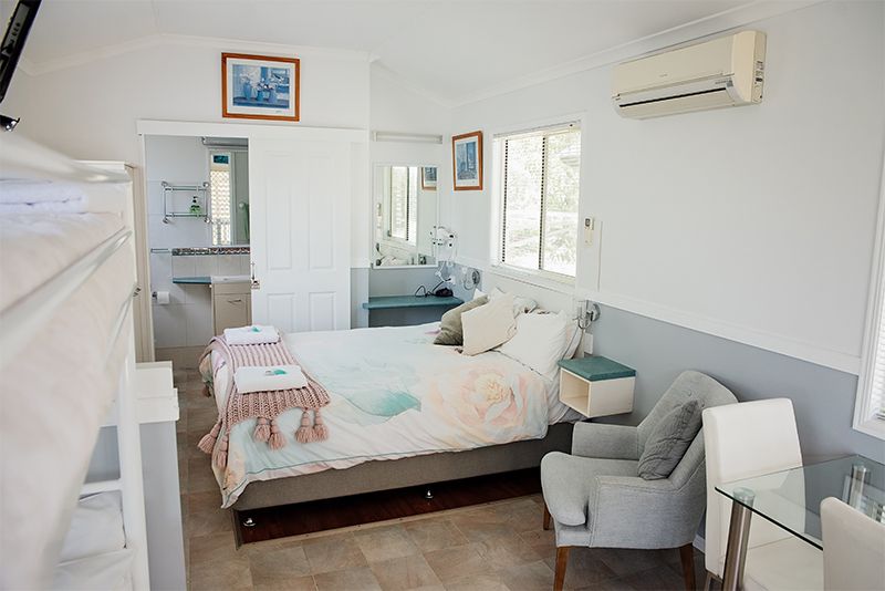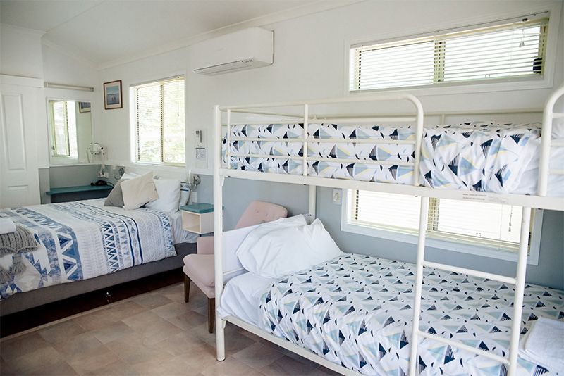 1 queen bed and bunks , sleeping 4 in total Disabilities accessible cabin available Self contained ensuite – shower & toilet Reverse cycle air conditioning All linen provided Private patios Under covering parking All utensils provided Television , DVD player & HD tv reception Electric hot plates and microwave in cabins . When Booking , all extra Adults and children are charged $ 15.00 per person , cabins sleep a maximum of 4 people .