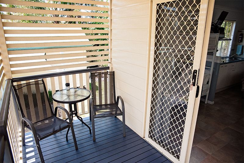1 queen bed and bunks , sleeping 4 in total Self contained ensuite – shower & toilet Reverse cycle air conditioning All linen provided Private patios Under covering parking All utensils provided Television , DVD player & HD tv reception Electric hot plates and microwave in cabins . When Booking , all extra Adult and children are charged $ 15.00 per person , cabins sleep a maximum of 4 people .