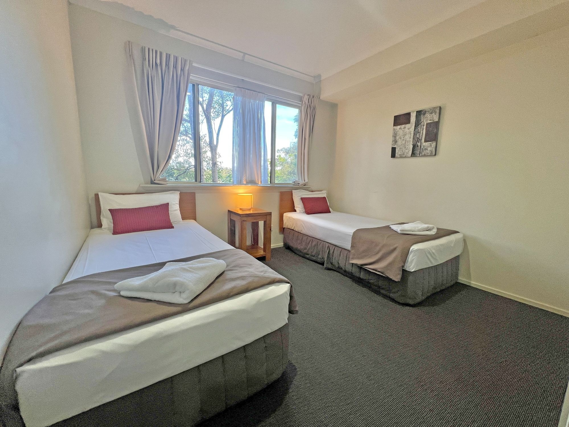 This apartment features a Queen bed in the main bedroom, and two single beds in the second bedroom as well as a third single bed set up in the living area. Please note for a fifth guest, you will need to add “extra person” to your reservation $.