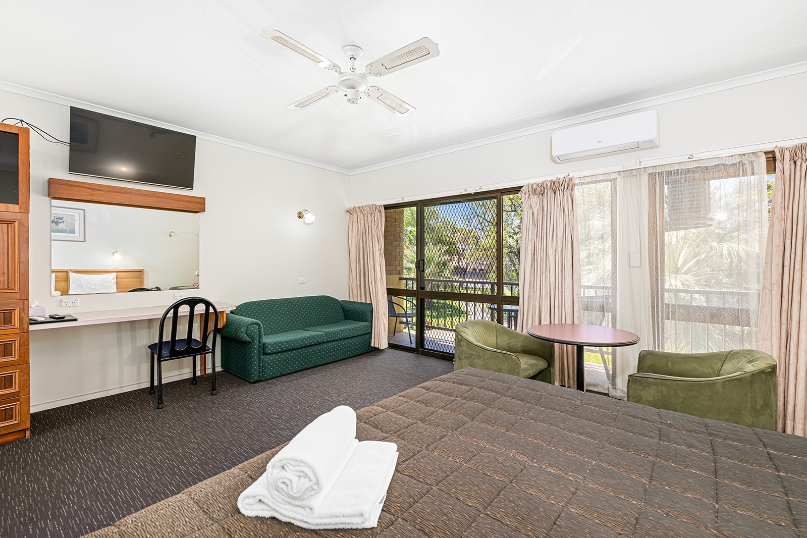 Spacious room with spa bath, 42-inch LCD TV, and a balcony overlooking parkland. Free WiFi is available.