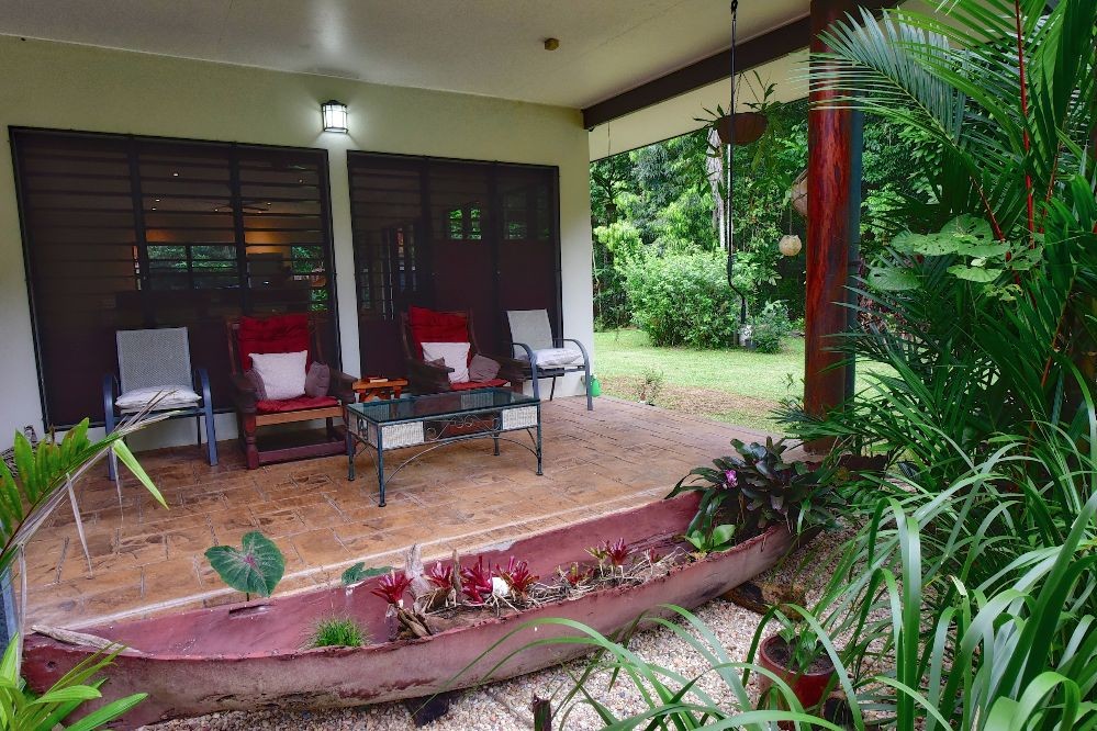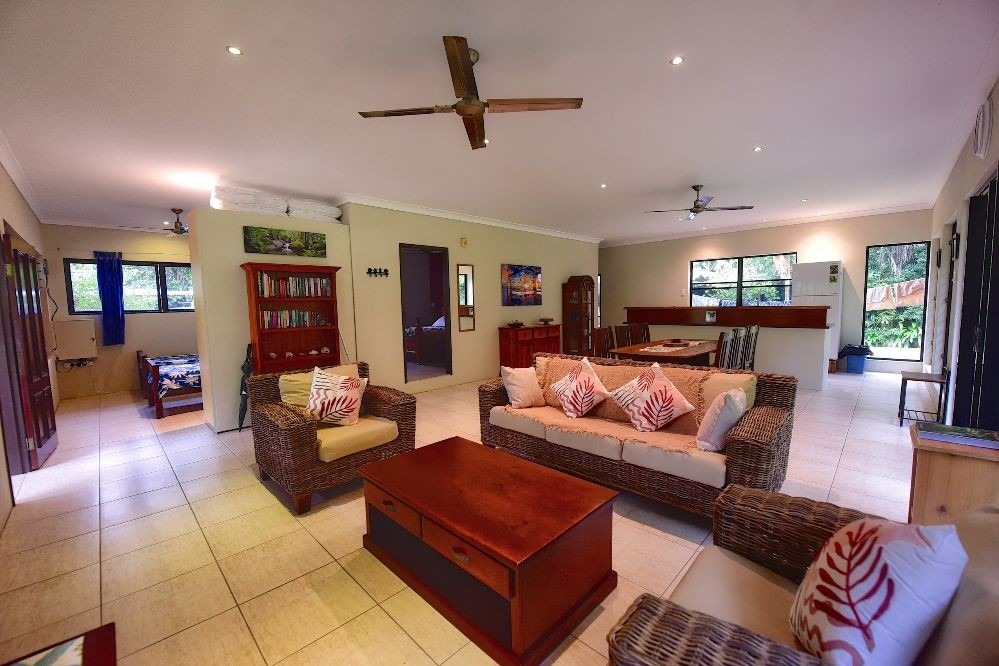 The Big Bungalow is a 3 bedroom house with a king bedroom, queen bedroom and a twin bedroom, open plan living dining area, full kitchen with full size fridge, gas oven with 4 burner stove top, fully screened throughout, ceiling fans, TV and DVD player, laundry facilities, 4 burner gas bbq, bathroom and private porch with views to the Coral Sea, surrounded by tropical gardens and rainforest. Under cover parking for one car.