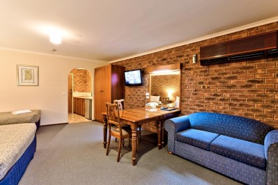 Spacious room with Queen bed and single bed - sleeps max. of 3 guests. Room has rural views, kitchenette, bar fridge,kettle,toaster, a/c-rev.,tv, table & chairs, verandah. PRICING IS FOR 2 GUESTS.